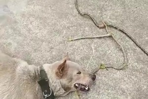 狗狗出去溜达回来累得趴下了,结果还咬了棵野生草药回来!